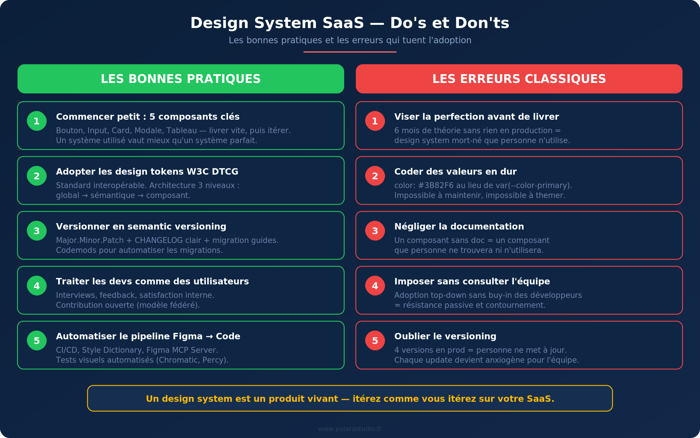 Résistez à la tentation de tout couvrir dès le départ. Un design system qui commence avec 30 tokens bien définis vaut mieux qu’un catalogue de 300 tokens que personne ne comprend. Chez Polara Studio, notre équipe UX/UI recommande de commencer petit et d’itérer — exactement comme un produit.