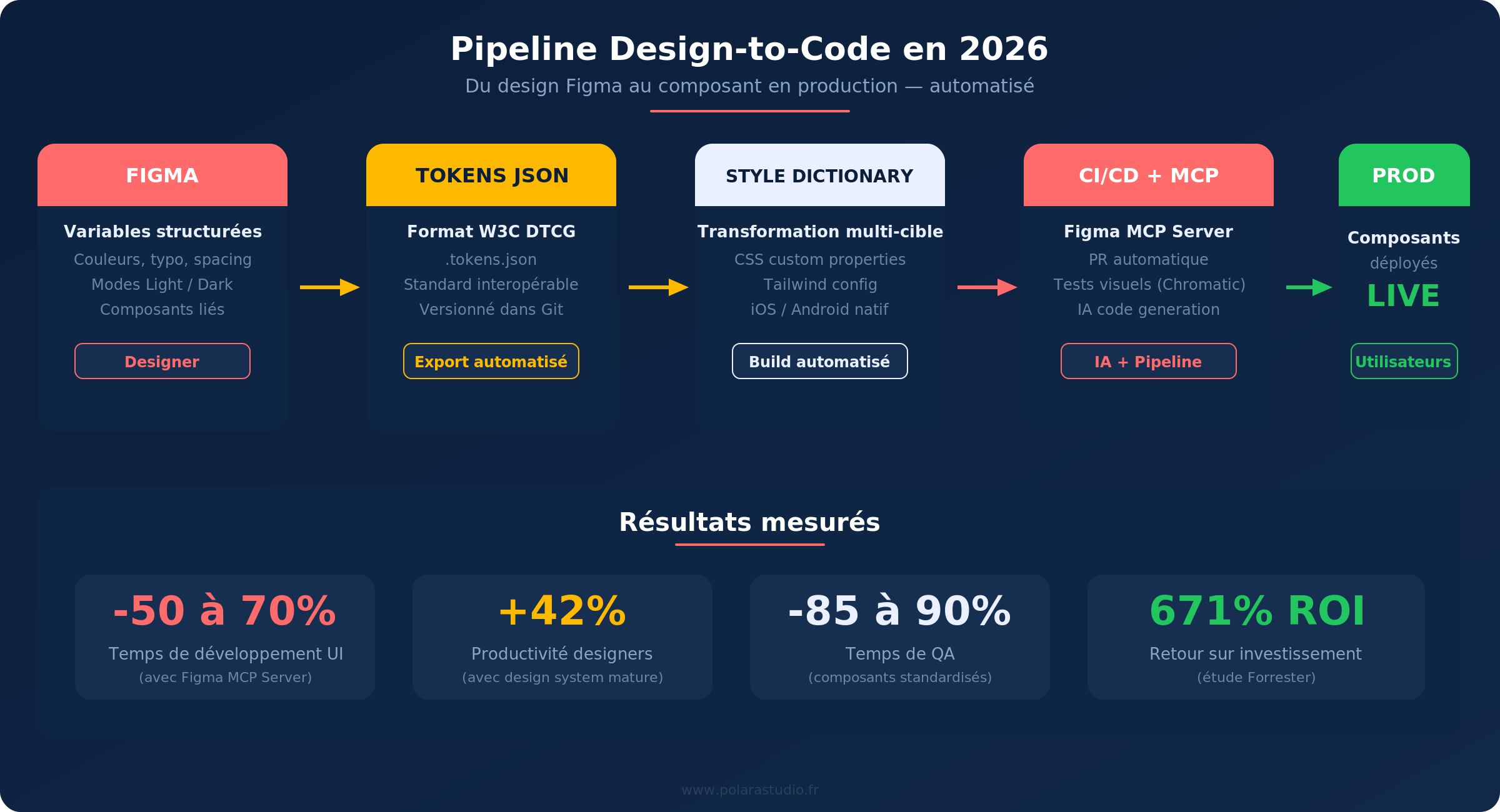 Les résultats sont impressionnants : les équipes rapportent une réduction de 50 à 70 % du temps de développement initial sur les composants UI, avec un code qui respecte le design system dès la première itération. Le pipeline complet ressemble à ça :