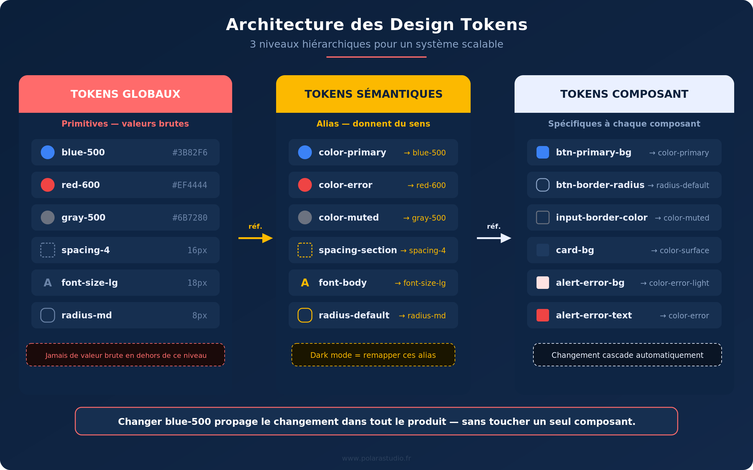 Cette architecture garantit qu’un changement de couleur primaire se propage en cascade dans tout votre produit — sans toucher un seul composant. C’est le fondement même de la scalabilité.